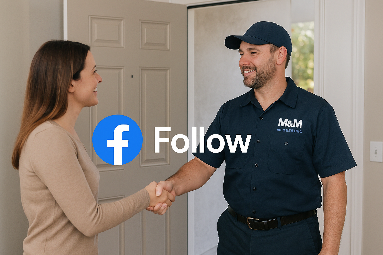 M&M AC & Heating logo with text inviting to follow on Facebook for updates and offers.